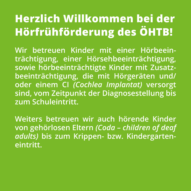 Wir betreuen Ihr hör- bzw. hörsehbeeinträchtigtes Kind vom Zeitpunkt der Diagnosestellung bis zum Schuleintritt, Codas bis zum Krippen- bzw. Kindergarteneintritt.